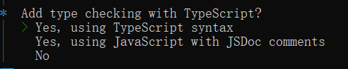 选择这个选项会在项目中使用 JavaScript 语法,但通过 JSDoc 注释来提供类型信息。JSDoc 是一种在 JavaScript 代码中添加文档注释的方式,这些注释可以用来描述函数、变量等的类型信息。这种方式不需要将代码转换为 TypeScript 语法,但仍然可以提供一定程度的类型检查。 - No