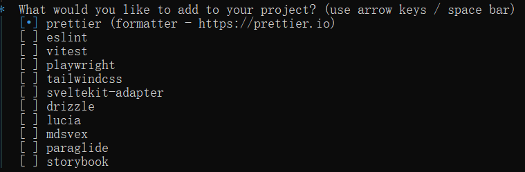 可使用方向键移动,空格键选择,回车键进入下一步- prettier:一个流行的代码格式化工具,可以帮助开发者以一致的风格格式化代码。它支持多种编程语言,并且可以通过配置文件自定义格式化规则。