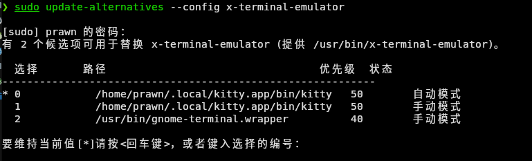 1 | sudo update-alternatives --install /usr/bin/x-terminal-emulator x-terminal-emulator /usr/bin/kitty 50 |